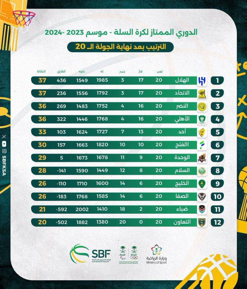 ويتنافس على المركز الأول الهلال والاتحاد، ويتساويان في النقاط برصيد (٣٧) نقطة، الهلال في المركز الأول، بينما الاتحاد في المركز الثاني، ويتقدم الهلال بفارق التهديف في مواجهات الفريقين، إذ فاز الهلال على نظيره الاتحاد ٨٥-٥٩.