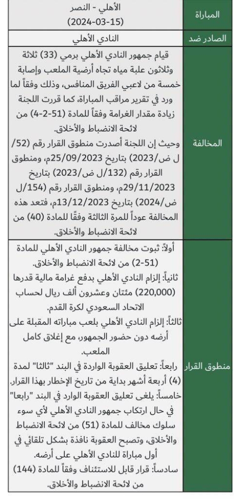 جاء قرار لجنة الانضباط والأخلاق في الاتحاد السعودي لكرة القدم بإلزام النادي الأهلي بلعب مباراته القادمة على أرضه دون حضور الجماهير بسبب رمي جماهيره 33 عبوة مع تعليق هذه العقوبة لمدة 4 أشهر وتنفيذها في حال ارتكاب جماهير النادي لأي سوء سلوك مخالف للمادة 51، ليأتي هذا القرار مهدداً بشكل مباشر لمباراة الكلاسيكو الكبير بين الأهلي والهلال التي ستقام في الـ 19 من شهر أبريل القادم ضمن الجولة الـ 28 من دوري روشن، ليُلعب خلف أبواب مغلقة في حال حصول أي تجاوزات من جماهير الأهلي في لقاء الديربي المنتظر الذي سيجمع الأهلي والاتحاد مساء الإثنين القادم، حيث إن الأهلي سيعتبر مستضيفاً للديربي وأول لقاء سيستضيفه على ملعبه بعد الديربي هو لقاء الكلاسيكو الذي سيجمعه بالهلال.
