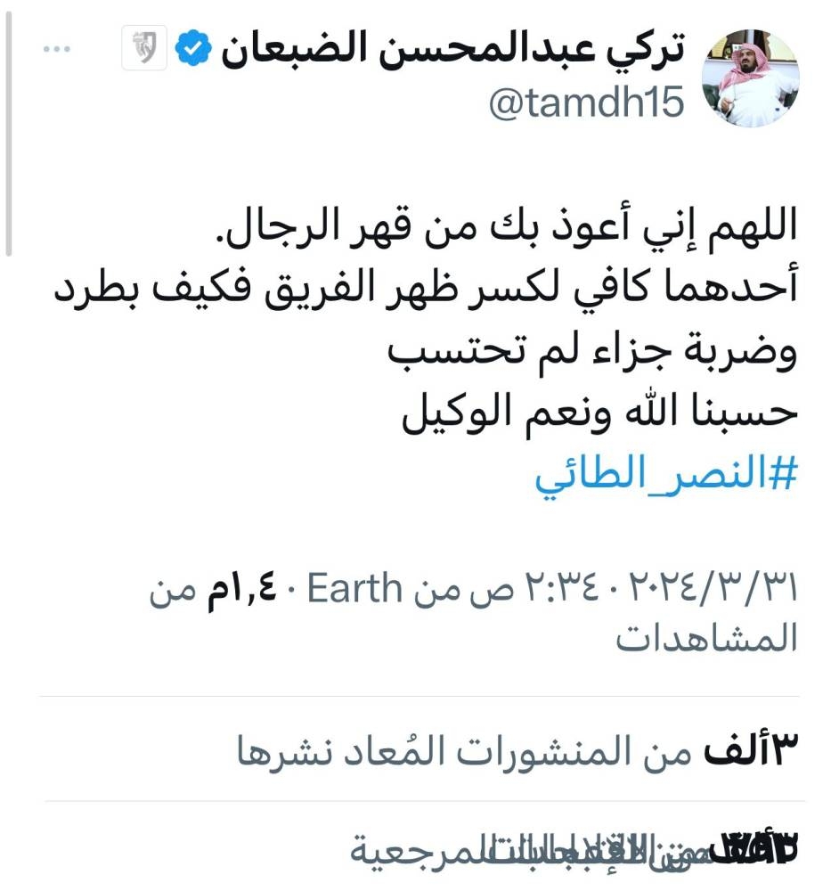 شن رئيس نادي الطائي تركي الضبعان هجوماً لاذعاً على مستوى التحكيم الذي قاد مباراة فريقه أمام النصر ضمن الجولة الـ25 من دوري روشن والتي خسرها بخمسة أهداف مقابل هدف، وذلك عبر تغريدة نشرها في حسابه الخاص في منصة «X»، حيث وصف ما تعرض له فريقه أمام النصر بـ«قهر الرجال»، شاكيًا الظلم التحكيمي الذي اعتبر بأنه نحر فريقه بشكل واضح نتيجة هذه الأخطاء، وجاءت تغريدته على النحو التالي: «اللهم إني أعوذ بك من قهر الرجال.. أحدهما كافٍ لكسر ظهر الفريق فكيف بطرد، وضربة جزاء لم تحتسب، حسبنا الله ونعم الوكيل». هذا وقد حاول الضبعان الدخول في مناقشة حكام اللقاء بعد المباراة، لكن لجنة المراقبة رفضت ذلك، مما جعله يغادر ملعب المباراة دون الحديث للإعلام.