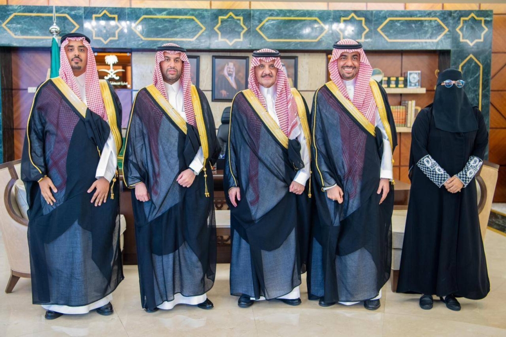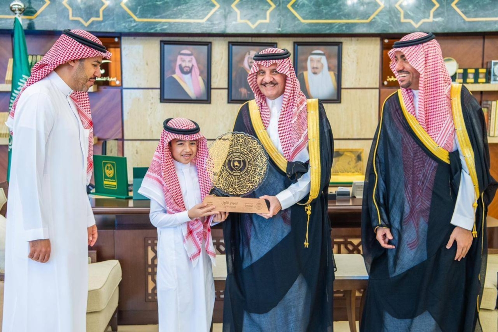 وكرم الأمير سعود بن نايف خلال الاستقبال الفائزين بالمركز الأول لكل من الفروع الخمسة في مسابقة نادي القادسية لتحفيظ القرآن الكريم، وهم: