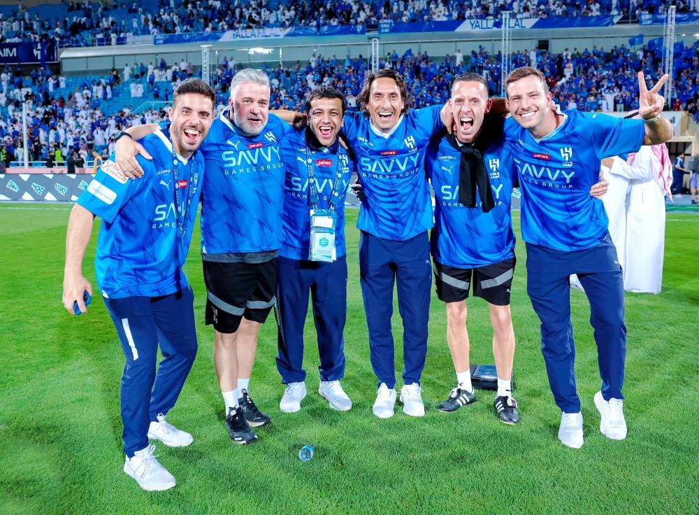 مساعد المدرب الكابتن محمد الشلهوب مع أعضاء الجهاز الفني في فريق الهلال.
