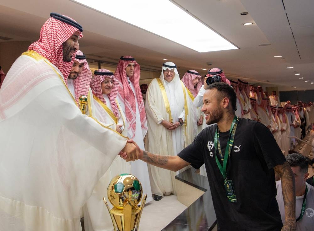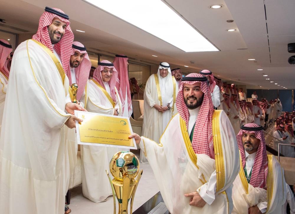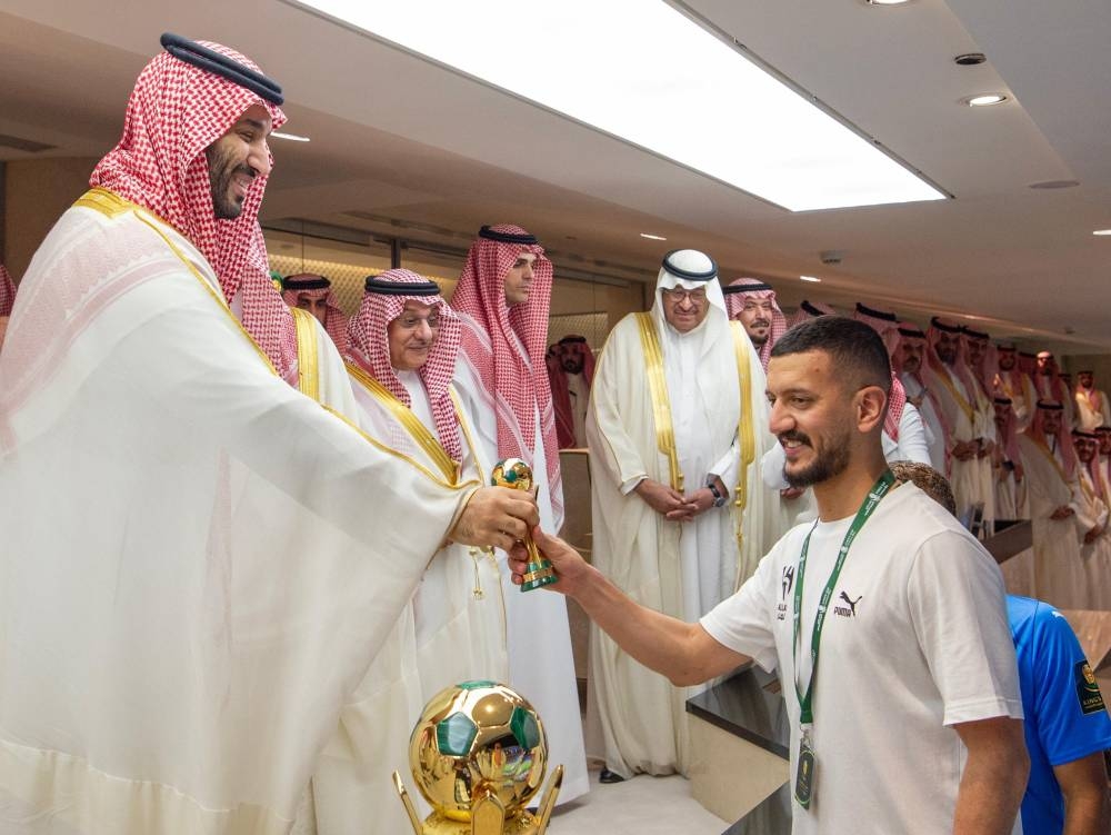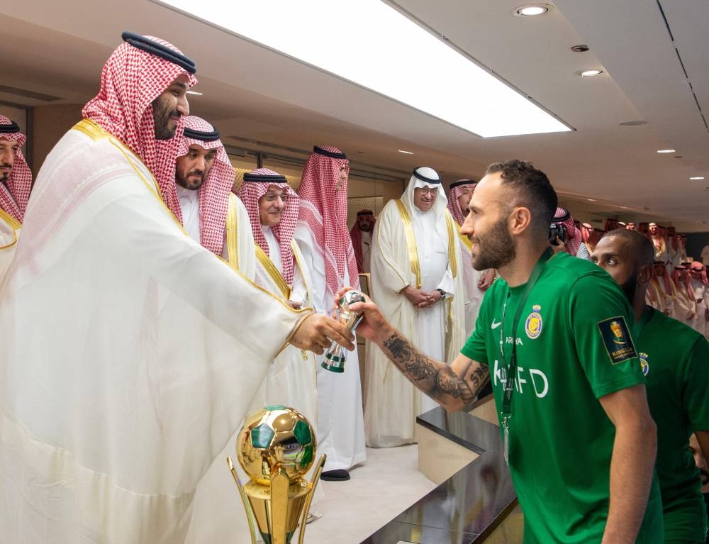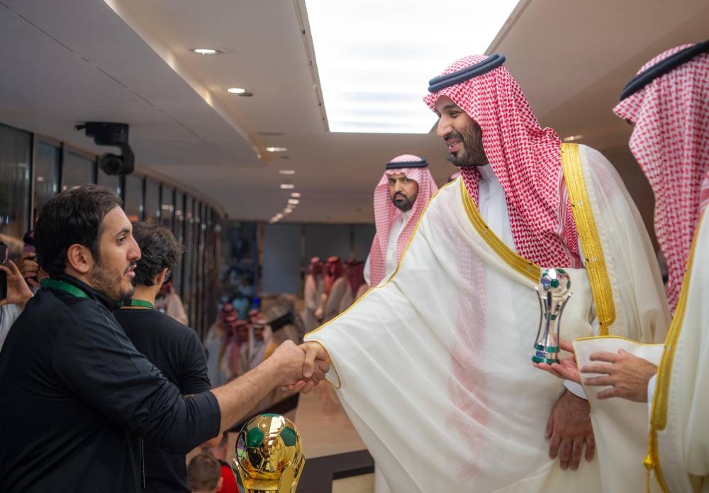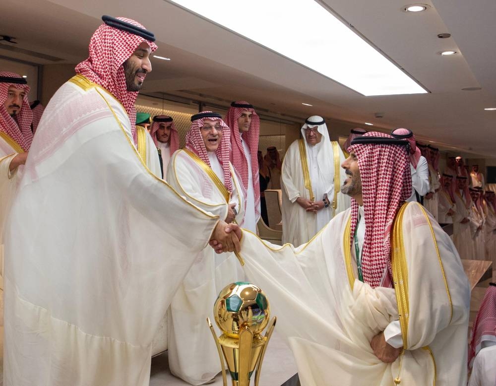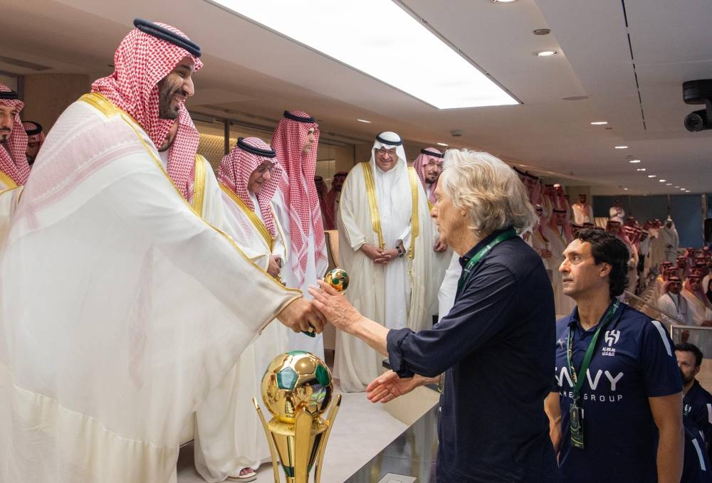 وعقب المباراة التي انتهت لصالح فريق الهلال بركلات الترجيح بنتيجة 5 ـ 4 صافح ولي العهد طاقم تحكيم المباراة وأعضاء الفريقين.