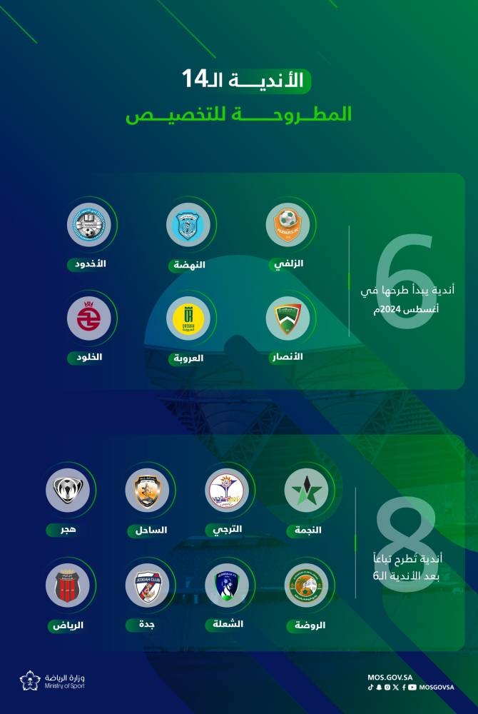 وتشمل هذه المرحلة، طرح 6 أندية رياضية للتخصيص أمام المستثمرين المحليين والدوليين، وهي: الزلفي، النهضة، الأخدود، الأنصار، العروبة، والخلود، إذ يمكن للمستثمرين الراغبين في المنافسة على هذه الأندية الدخول على بوابة المستثمرين، عبر موقع المركز الوطني للتخصيص للتقديم، والحصول على الاشتراطات والمعلومات اللازمة، بدءاً من مطلع شهر أغسطس المقبل، على أن يتبع ذلك استكمال طرح بقية الأندية الثمانية تباعاً، وهي: (الشعلة، هجر، النجمة، الرياض، الروضة، جدة، الترجي، الساحل).