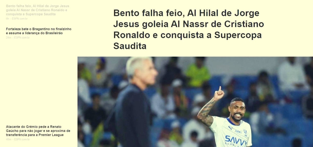 كما كتبت صحيفة «فووت ميركاتو» الفرنسية: «كأس السوبر السعودي هلالي بعد أن تفوق الزعيم على النصر مرة ثانية في النهائي، ولم يستفد الفريق النصراوي من خدمات الأسطورة كريستيانو رونالدو في حصد المزيد من البطولات سوى بطولة كأس الملك سلمان للأندية العربية بالطائف».