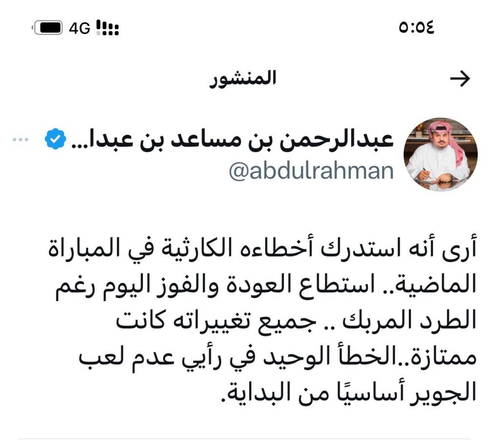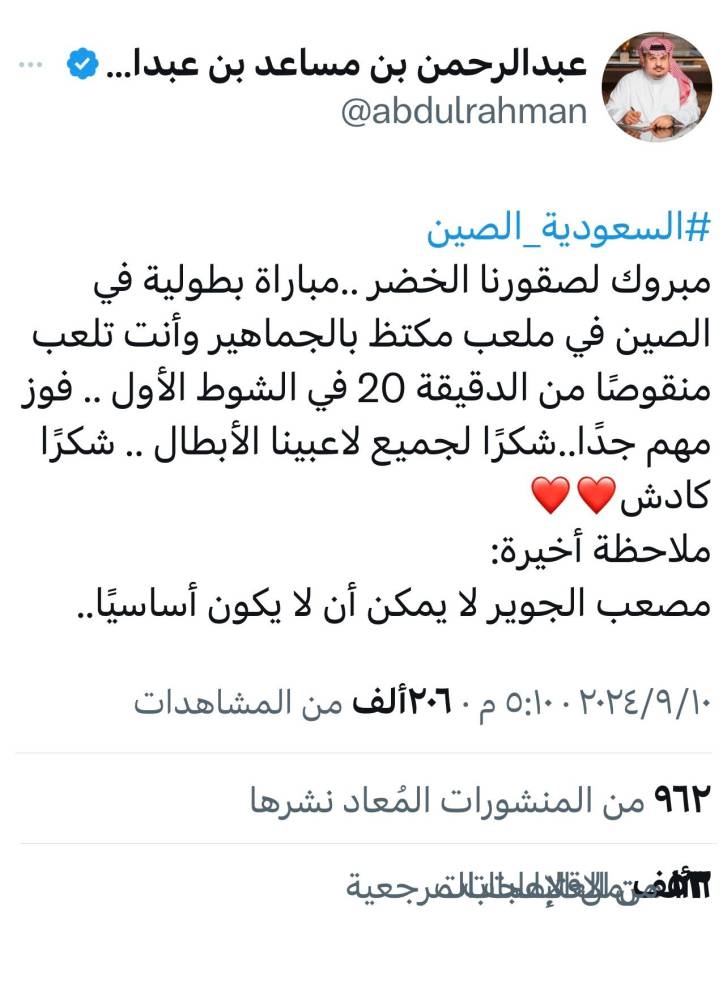 بارك الأمير عبدالرحمن بن مساعد الفوز لمنتخبنا الوطني على المنتخب الصيني بين أرضه وجماهيره في المباراة التي أقيمت ضمن الجولة الثانية المؤهلة لكأس العالم عبر حسابه في منصة إكس، وقال: «مبروك لصقورنا الخضر مباراة كانت بطولية في الصين في ملعب مكتظ بالجماهير وأنت تلعب منقوصا من الدقيقة 20 في الشوط الأول.. فوز مهم جدا، شكرا لجميع لاعبينا الأبطال، شكرا للاعب كادش»، وأضاف: «ملاحظة أخيرة اللاعب مصعب الجوير لا يمكن أن لا يكون أساسيا»، وقال: «أرى بأن مدرب المنتخب استدرك أخطاءه الكارثية في المباراة الماضية.. واستطاع العودة وتحقيق الفوز رغم الطرد المربك». وأضاف: «جميع تغييراته كانت ممتازة.. الخطأ الوحيد في رأيي عدم إشراك اللاعب مصعب الجوير أساسيا من البداية».