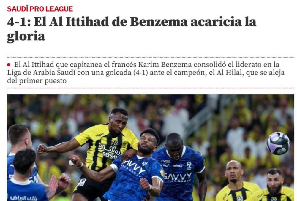 وكتبت صحيفة «ماركا» الإسبانية: «بنزيما في الطريق نحو اللقب، والاتحاد يتغلب على الهلال في صراع البطولة». وأكدت صحيفة «موندو ديبورتيفو» الإسبانية: «بنزيما بقيادته جعل الاتحاد يقترب من المجد». وأضافت: «الاتحاد يمشي بخُطى ثابتة نحو الفوز بالبطولة». وعنونت صحيفة «آس» الإسبانية: «كريم بنزيما يبدع في الكلاسيكو ويبتعد بفريقه بفارق النقاط السبع عن أقرب منافسيه».