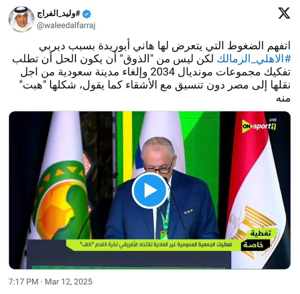 وفي هذا السياق، علّق الإعلامي الرياضي السعودي وليد الفراج على الأمر، قائلاً: «أتفهم الضغوط التي يتعرض لها هاني أبو ريدة بسبب ديربي الأهلي والزمالك، لكن ليس من المنطقي أن يكون الحل اقتراح تعديل توزيع مجموعات مونديال 2034 دون تنسيق مسبق مع الأشقاء في المملكة. مثل هذه الطلبات تحتاج إلى إجراءات واضحة وتفاهمات مسبقة».
