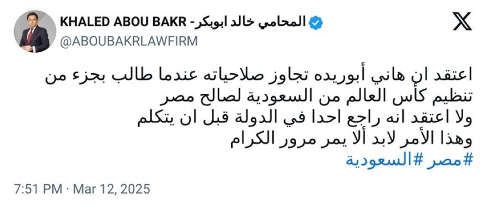أما المحامي المترافع أمام المحاكم الأوروبية مستشار هيئة قناة السويس المصرية خالد أبو بكر، فقد أشار إلى أن هذا التحرك قد يكون تجاوزاً للصلاحيات، قائلاً: «أعتقد أن هاني أبو ريدة تجاوز صلاحياته عندما طالب بجزء من تنظيم كأس العالم من السعودية لصالح مصر، ولا أعتقد أنه راجع أحداً في الدولة قبل أن يتكلم، وهذا الأمر لابد ألا يمر مرور الكرام».