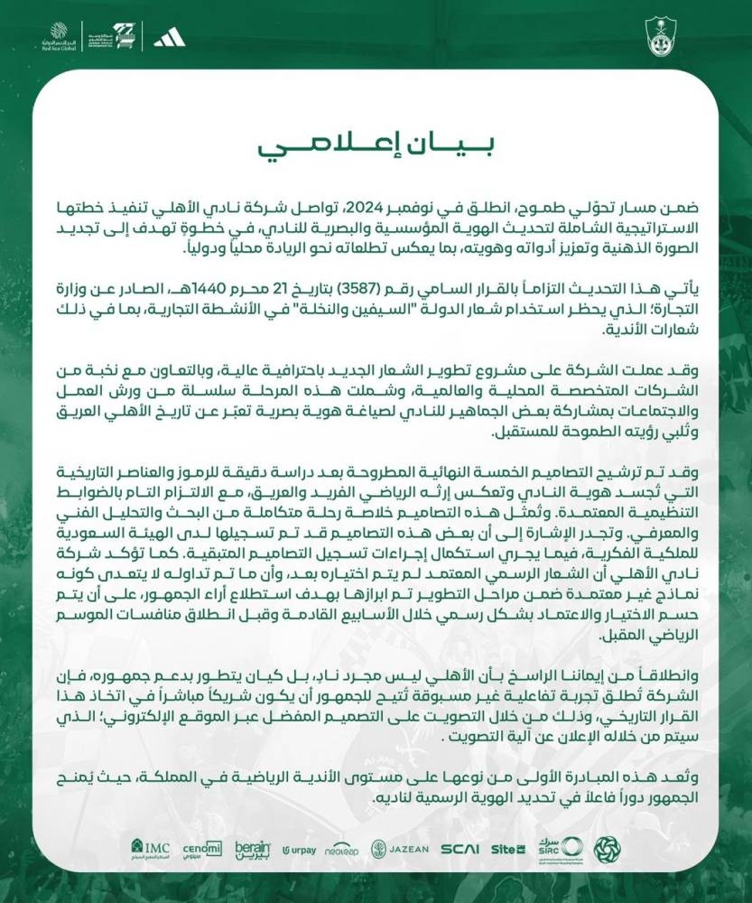 وأكد النادي أن هذه الخطوة تُجسد توجهه المؤسسي والطموح نحو التميز محلياً ودولياً، ومواصلة تنفيذ إستراتيجيته لتحديث هويته المؤسسية والبصرية، في مشروع شامل ينطلق ضمن مسار «تحولي طموح» أُطلق في نوفمبر 2024.
