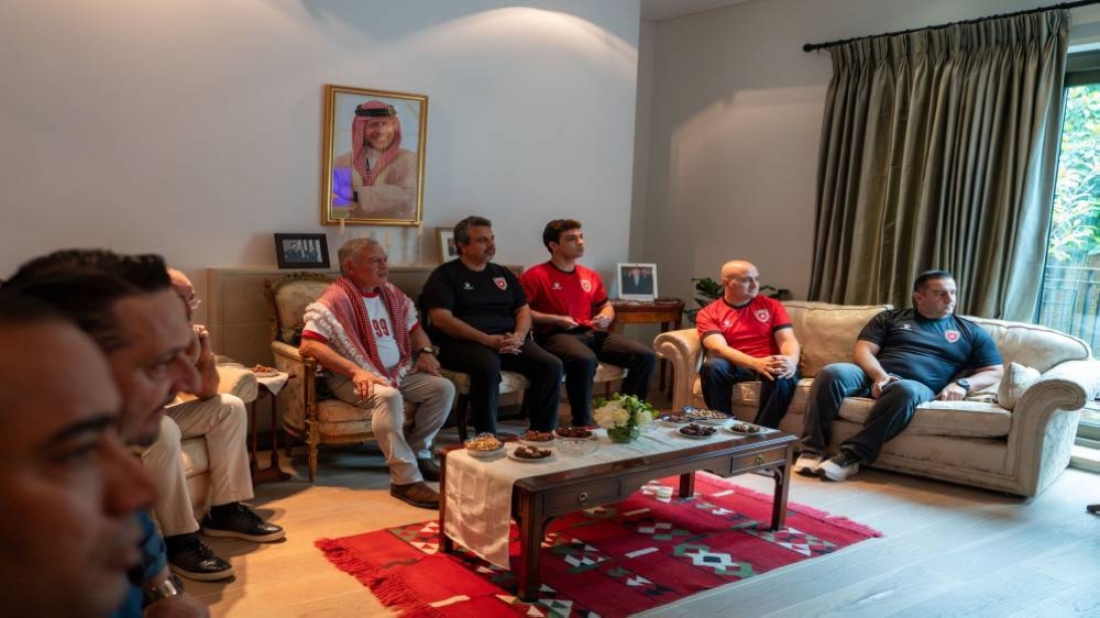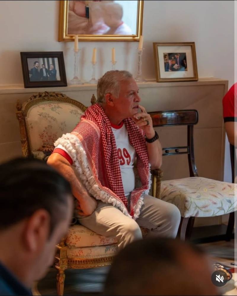 King Abdullah II was keen to follow the match between his national team and their Omani hosts, which took place today (Thursday) in the ninth round of the third stage of the qualifiers for the 2026 World Cup, from the Jordanian embassy in London, during a foreign work visit. The official website of the Hashemite Royal Court published video clips on the social media platform "X" showing King Abdullah watching the match alongside some personalities, at the Jordanian embassy in London, during the foreign work visit. King Abdullah appeared during the match wearing the "Nashama" team jersey and the shemagh, according to the report broadcast by the "RT" website.