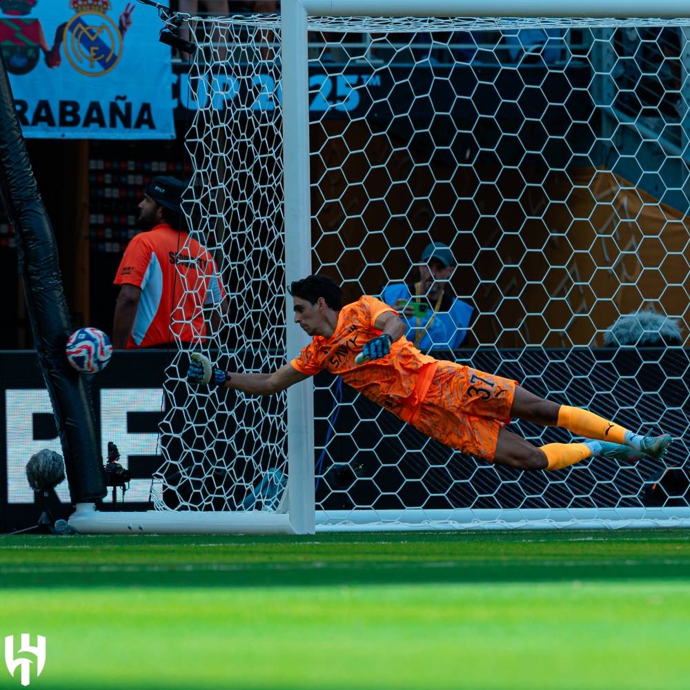 The match started strongly for Al-Hilal with a powerful shot from Sergej Savic that was barely saved by goalkeeper Courtois. Savic then took a free kick, but it hit the wall. Real Madrid responded with a shot from Valverde that was brilliantly saved by Yassine Bounou. Al-Hilal retaliated with a shot from Salem Al-Dawsari, which Leonardo redirected towards Real Madrid's goal, but it went past the post. Al-Hilal continued to dominate, and during a counter-attack, Renan Lodi faced Belgian goalkeeper Courtois and shot at the goal, but the offside flag was raised. From an organized attack, Bellingham passed the ball to his teammate Rodrigo, who broke the offside trap and delivered a ground pass to striker Gonzalo Garcia, who scored for Real Madrid (34'). Al-Hilal quickly responded after a brilliant skill from Leonardo, who was fouled inside the penalty area, leading the referee to award a penalty kick. Ruben Neves stepped up and successfully converted it to the left of goalkeeper Courtois, equalizing for Al-Hilal (41'). Real Madrid nearly took the lead again, but Arda Güler's shot hit the post. A dangerous opportunity arose for Al-Hilal after Nasser Al-Dawsari pressured the Madrid defense, allowing the ball to reach Leonardo, who shot into the side netting. In the dying moments, the referee awarded a penalty to Real Madrid, which Valverde took, but goalkeeper Yassine Bounou excelled and saved it, keeping the score level. After 8 minutes of stoppage time, the referee announced the end of the match with a score of 1-1.