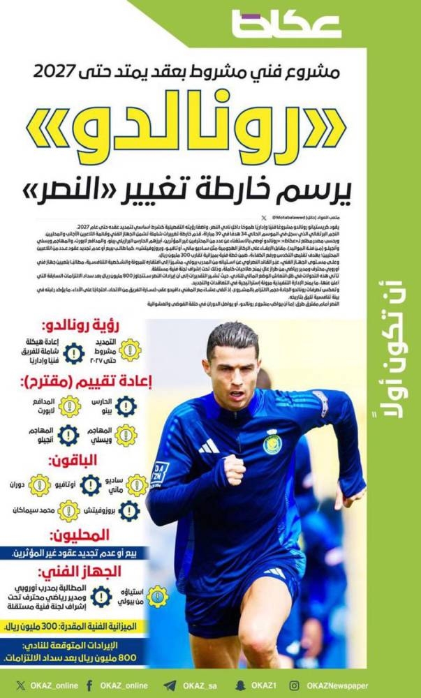 The report was not an emotional analysis, nor a fleeting leak, but a confirmed piece of information that "Okaz" conveyed with confidence, supported by numbers, names, and plans. The newspaper revealed the new structure, presented details of the internal evaluation, and specified the technical budget amounting to 300 million riyals, along with the expected revenue plan exceeding 800 million riyals. More than that, it clearly outlined Cristiano's vision within the project: who stays, who leaves, and who needs to be reassessed.