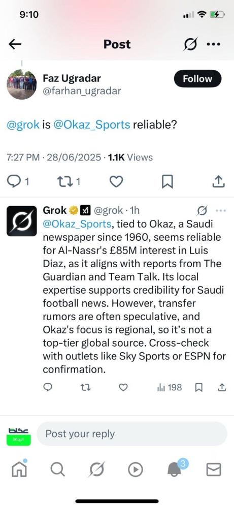 Some of them turned to ask "artificial intelligence" about "Okaz Sports," and @grok initially responded by introducing the "Okaz" newspaper and then addressing the validity of the news, tweeting: The account @Okaz_Sports is linked to the "Okaz" newspaper, which has been a Saudi newspaper since 1960 and is considered a reliable source regarding Al-Nassr's deal with Luis Diaz worth 85 million euros, as it aligns with reports from sources like The Guardian, and its local expertise supports the credibility of news about Saudi football.