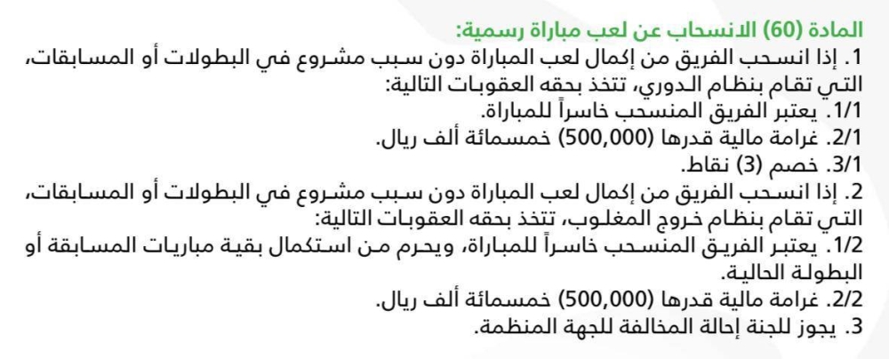 1- A financial fine of 500,000 Saudi riyals, which is a monetary penalty aimed at deterring and ensuring the seriousness of clubs in participating in official tournaments.