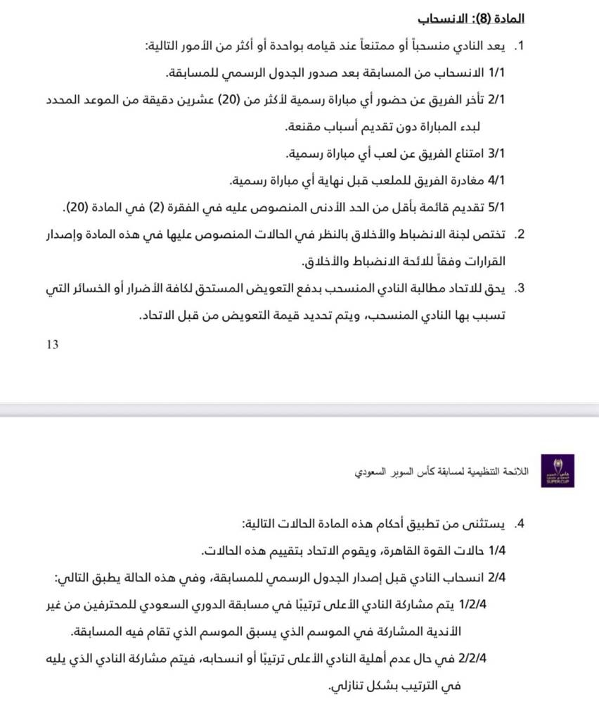 3- Non-completion of the tournament, which means the team is officially out of the Super Cup without any chance of returning or reconsidering its participation, even if circumstances change later.