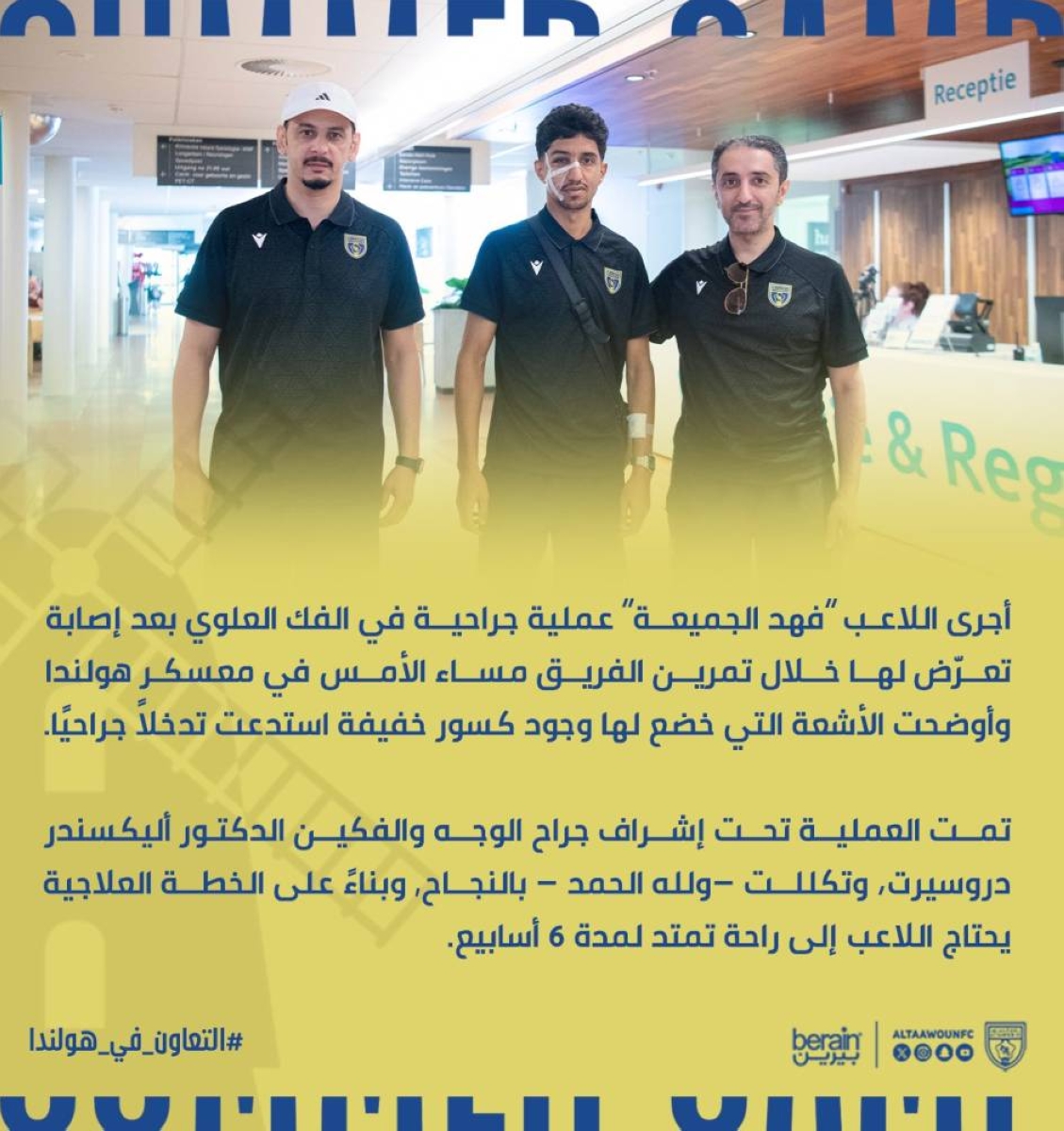 وقال النادي عبر بيان رسمي أصدره في حسابه الرسمي في منصة «X»: «أجرى اللاعب فهد الجميعة عملية جراحية في الفك العلوي بعد إصابة تعرض لها خلال تمرين الفريق مساء الثلاثاء في معسكر هولندا، وأوضحت الأشعة التي خضع لها وجود كسور خفيفة استدعت تدخلاً جراحياً».