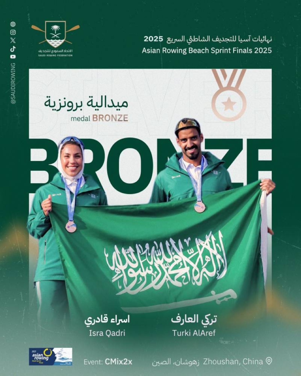 The Saudi national rowing team demonstrated a strong presence at the finals of the 2025 Asian Beach Sprint Rowing Championship, held at Nansha Beach in the Chinese city of Zhuhai, after finishing their participation with a historic tally of two silver medals and four bronze medals, amidst fierce competition that brought together the elite Asian boats. The delegation of the national team participating in the championship included: Hassan Qadri, Rad'an Al-Dosari, Muflih Al-Khalidi, Abdullah Al-Mami, Turki Al-Aref, Al-Jazi Al-Ibrahim, Israa Qadri, Haya Al-Mami, and Muayid Al-Rashidi, where all the players presented commendable levels and high spirits that reflected the development of the sport in the Kingdom, under the leadership of head coach Matthew Taranet, and with the support of coach Fernando Gomez, who worked on enhancing the players' performance and preparing them for a high level of competition. The administrator Hamoud Al-Shammari also played a prominent role in providing logistical support and ensuring the full readiness of the delegation, enabling the players to achieve this accomplishment, which came as follows: