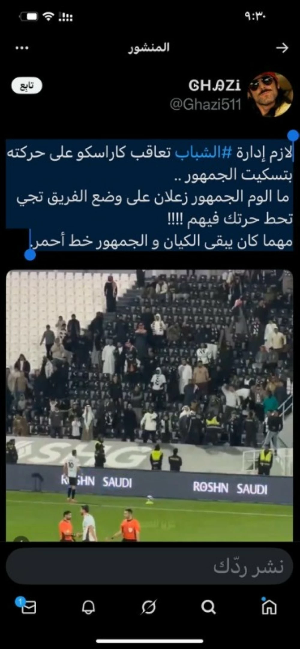 وكتب أحد المشجعين عبر منصة «إكس»: «يجب على إدارة الشباب أن تعاقب كاراسكو على حركته بتسكيت الجمهور، مهما كان اللاعب يبقى الكيان والجمهور خطاً أحمر».