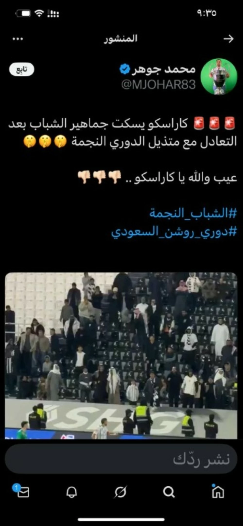 فيما علّق مشجع آخر قائلاً: «كاراسكو يسكت جماهير الشباب بعد التعادل مع متذيل الدوري النجمة... عيب والله».