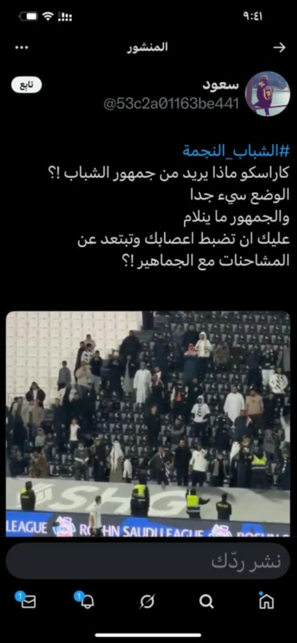 A third user added: "Carrasco, what does he want from the Al-Shabab fans? The situation is very bad, and the fans are not to blame; you need to control your nerves and avoid conflicts with the fans."