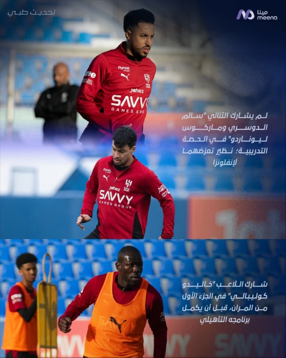 Al-Hilal's account on the "X" platform clarified that the duo Salem Al-Dosari and Marcos Leonardo did not participate in the training session due to being infected with the flu, which puts their participation against Al-Ahli in jeopardy.