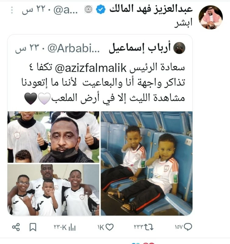 The "X" platform witnessed an amusing interaction before the match between Al-Shabab Club and Al-Hilal Club, after one of the Lions' fans, Arbab Ismail, sent a direct message to the club president, Abdulaziz Al-Malik.