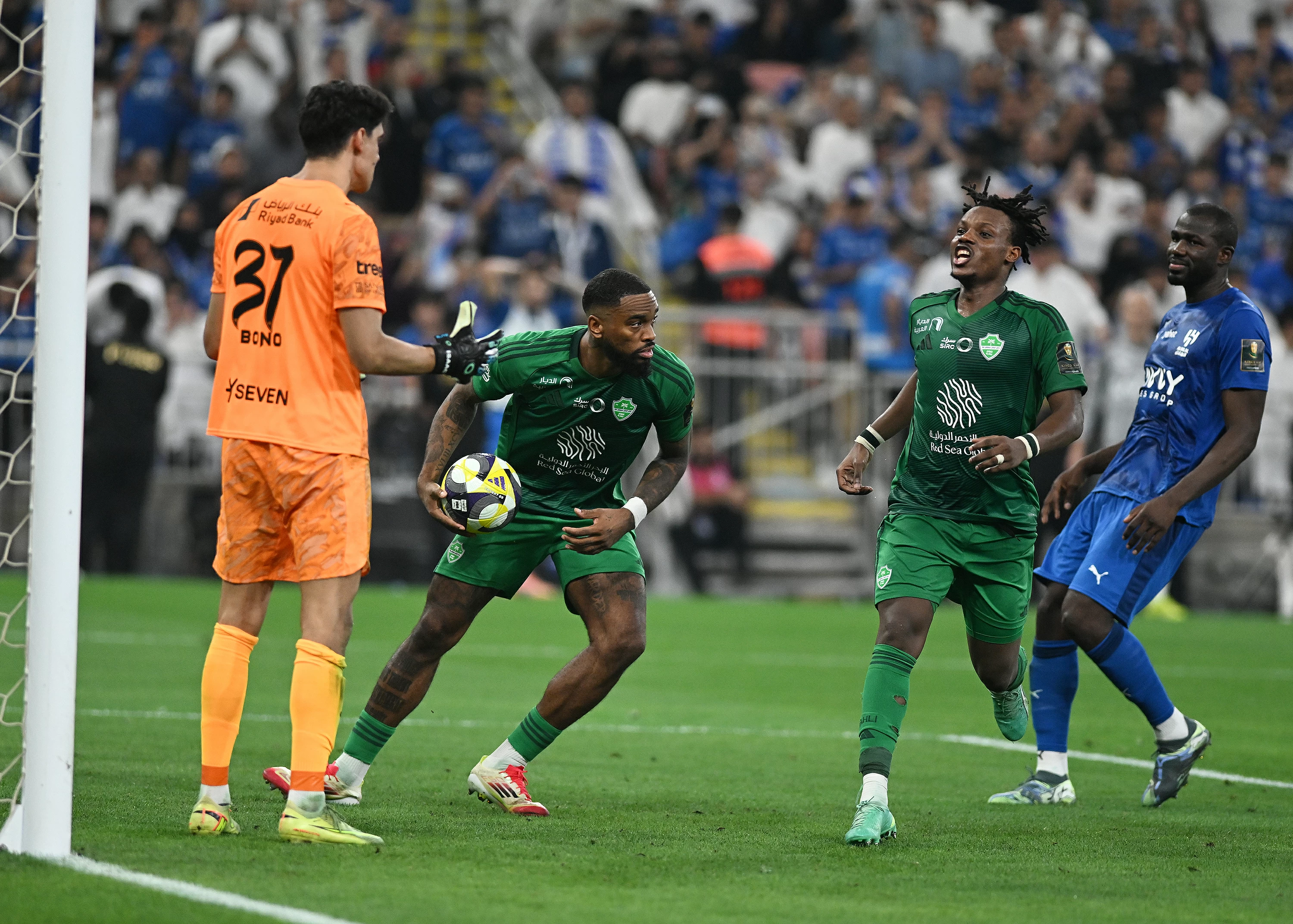 The Moroccan goalkeeper Yassine Bounou led his team Al-Hilal to the final of the most prestigious cup by saving two penalty kicks. The match saw Al-Hilal take the lead first through Théo Hernandez with a powerful shot to the center of the goal (39th minute), and Al-Ahli equalized through their striker Ivan Toney from a penalty kick (81st minute). The score remained unchanged in extra time, leading both teams to a penalty shootout. Al-Hilal managed to score 4 penalty kicks converted by: Ruben Neves, Marcos Leonardo, Sultan Mandash, and Théo Hernandez, while Al-Ahli scored 2 penalty kicks through: Franck Kessié and Ziad Al-Jahani, while both Ivan Toney and Jallinou missed their attempts.