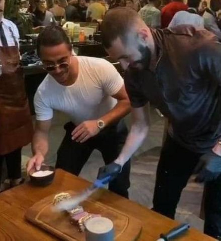 وحرص صاحب الـ32 عاماً على تقطيع اللحم المطلي بالذهب القابل للأكل بنفسه، ثم رش عليه حبيبات الملح الخشن على طريقة الشيف التركي، قبل أن يعانقه بمرح.
