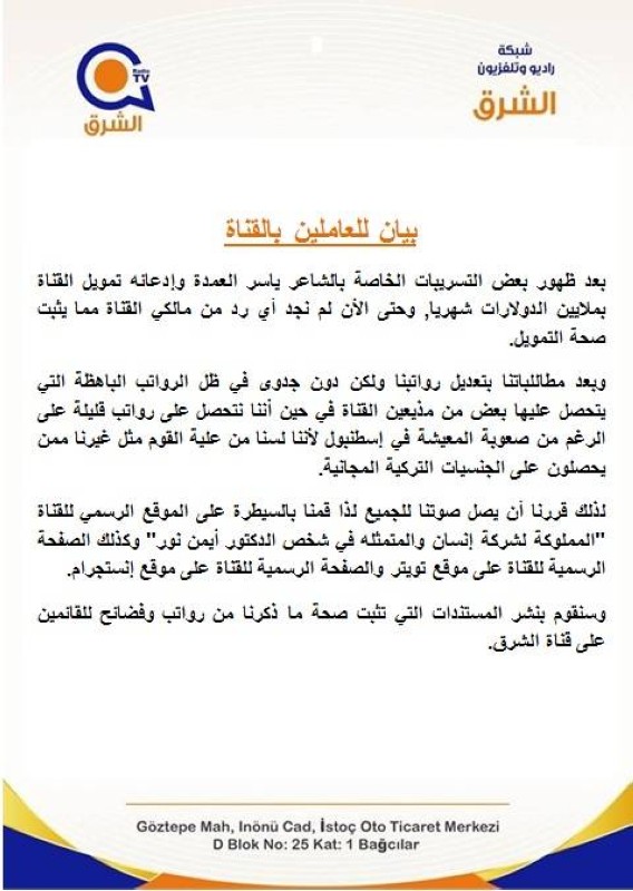 وتابع البيان: «لذلك قررنا أن يصل صوتنا للجميع.. لذا قمنا بالسيطرة على الموقع الرسمي للقناة المملوكة لشركة إنسان والمتمثلة في شخص الدكتور أيمن نور، وكذلك الصفحة الرسمية للقناة على موقع تويتر، والصفحة الرسمية للقناة على موقع إنستغرام»، مؤكدين أنهم سينشرون المستندات التي تثبت صحة ما ذكروا من رواتب وفضائح للقائمين على قناة الشرق الإخوانية.