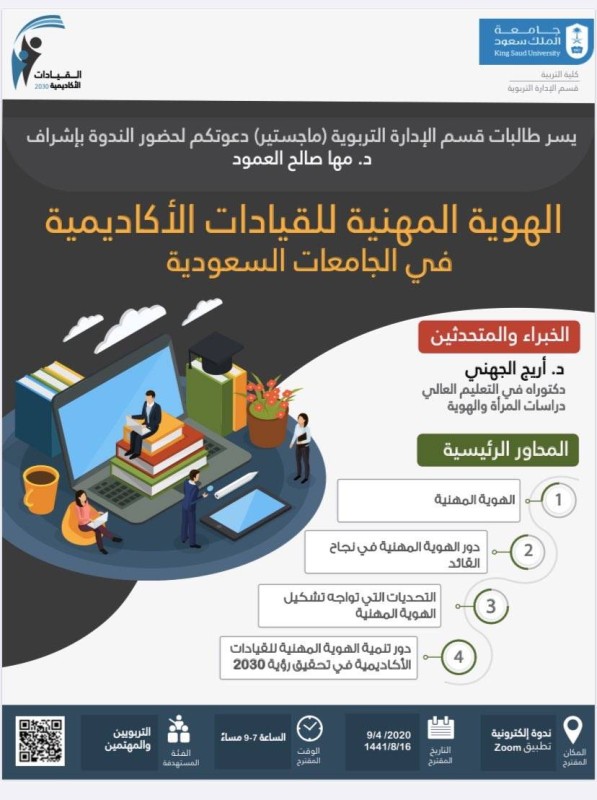 الندوة التي ينظمها قسم الإدارة التربوية في كلية التربية بجامعة الملك سعود تحت إشراف الدكتورة مها العمود، تبث عن بعد عبر برنامج ZOOM، عند الساعة 7:00 مساء.