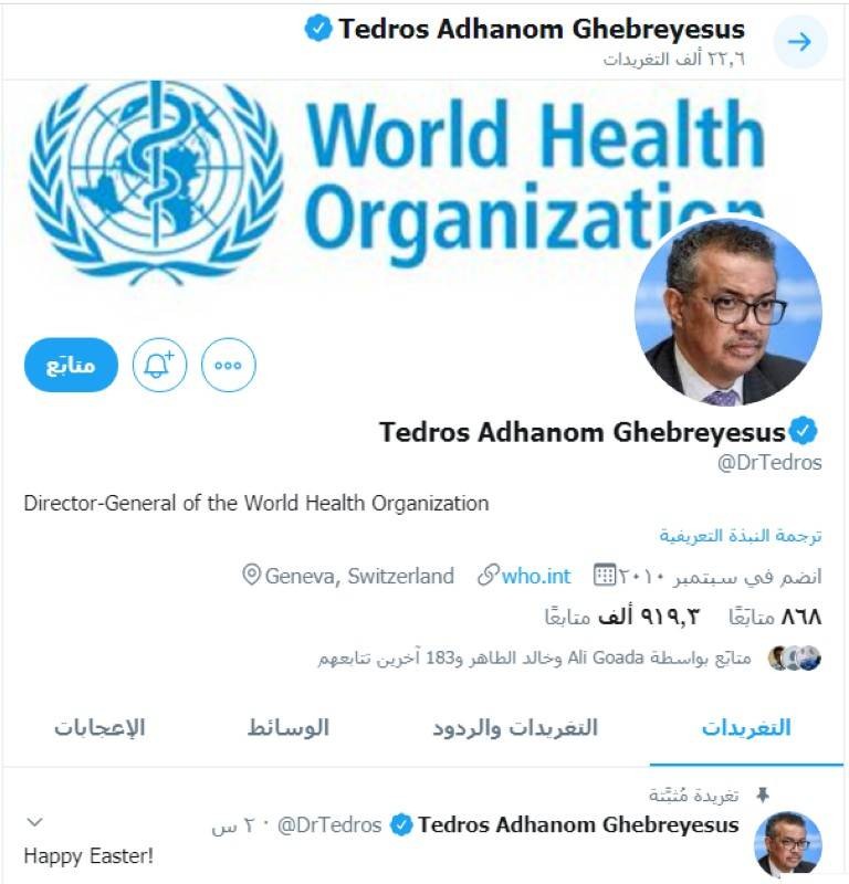 في خضم أزمة فايروس كورونا المستجد (كوفيد 19)، وتلهف العالم بأسره لعلاج لهذا الفايروس الذي أنهى حياة أكثر من 112 ألفا من بين 1.8 مليون مصاب حتى (العاشرة مساء الأحد)، ووسط أجواء الأزمة الأمريكية مع منظمة الصحة العالمية، في أعقاب اتهام الرئيس الأمريكي دونالد ترمب لها بفشلها في إدارة أزمة كورونا، كتب المدير العام لمنظمة الصحة العالمية، اﻟدﻛﺗور ﺗﻳدروس أدﻫﺎﻧوم ﻏﻳﺑرﻳﺳوس، كلمتين في تغريدة ثبتها على حسابه في تويتر، أنهاهما بعلامة التعجب! فاتحا بذلك باب التساؤل حول شفرة تلك العلامة. ولم تكن الكلمتان اللتان كتبهما تيدروس سوى Happy Easter! التي تعني بالعربية «عيد فصح سعيدا»، إلا أن علامة التعجب التي وضعها في نهاية الكلمتين، جعلت البعض يتساءل عما إذا كان يعني الحالة التي يمر بها العالم مع جائحة كورونا، وعدم السعادة والتناقض بين السعادة والجائحة. ويأتي ذلك بعد أيام قليلة من دعوته العالم لعدم تسييس الأزمة الناتجة عن تفشي الفايروس، داعيا إلى التضامن الصادق على المستوى العالمي وأن تتحلى الولايات المتحدة والصين بالقيادة النزيهة. وكان ترمب أكد أن واشنطن قد تعيد النظر في التمويل الذي تقدمه للمنظمة. وتعرض تيدروس لتهديدات بالقتل، في ظل تجدد الانتقادات لإدارته أزمة كورونا، على رغم محاولات منظمته الإسهام في الجهود العالمية لمكافحة جائحة فايروس كورونا المستجد. وأكد تيدروس في مؤتمر صحفي نشره موقع قناة الحرة الأمريكية، أنه تعرض لهجمات شخصية مستمرة منذ أكثر من شهرين أو 3 أشهر؛ منها شتائم عنصرية، أسود أو زنجي، وتهديدات بالقتل، وقال «لأول مرة أود أن أعلن هذا». يذكر أن تيدروس الذي يمضي عامه الثالث مترئسا المنظمة العالمية، ويتبقى له عامان، يعد أول مدير عام أفريقي فى تاريخ الوكالة الذي يمتد أكثر من 72 عاما، وانتخب للمنصب إثر توليه منصب وزير الصحة فى إثيوبيا 7 أعوام، ووزير خارجية لبلاده 4 أعوام. وسبق أن وجهت له انتقادات في 2017 بسبب تعامله مع أوبئة الكوليرا في إثيوبيا والسودان، واتهمه الخبراء آنذاك بالفشل في تصنيف تفشي المرض بشكل صحيح لتجنب إحراج النظامين الأفريقيين، وفق تقرير لموقع «ناشيونال إنترست».