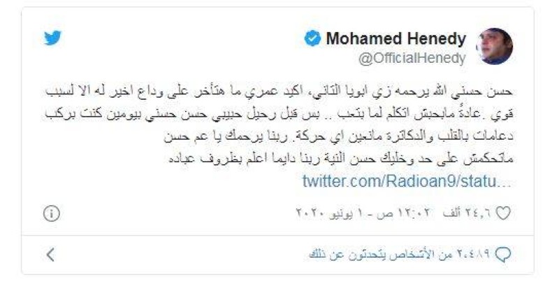 وجاء توضيح هنيدي ردا على تغريدات عدة اتهمته بالتقصير في حق أحد أعمدة الفن المصري، فكتب على حسابه في «تويتر»: «حسن حسني الله يرحمه زي أبويا التاني، أكيد عمري ما هتأخر على وداع أخير له إلا لسبب قوي، عادة ما بحبش أتكلم لما بتعب، بس قبل رحيل حبيبي عمي حسن حسني بيومين كنت بركب دعامات بالقلب والدكاترة مانعين أي حركة».
