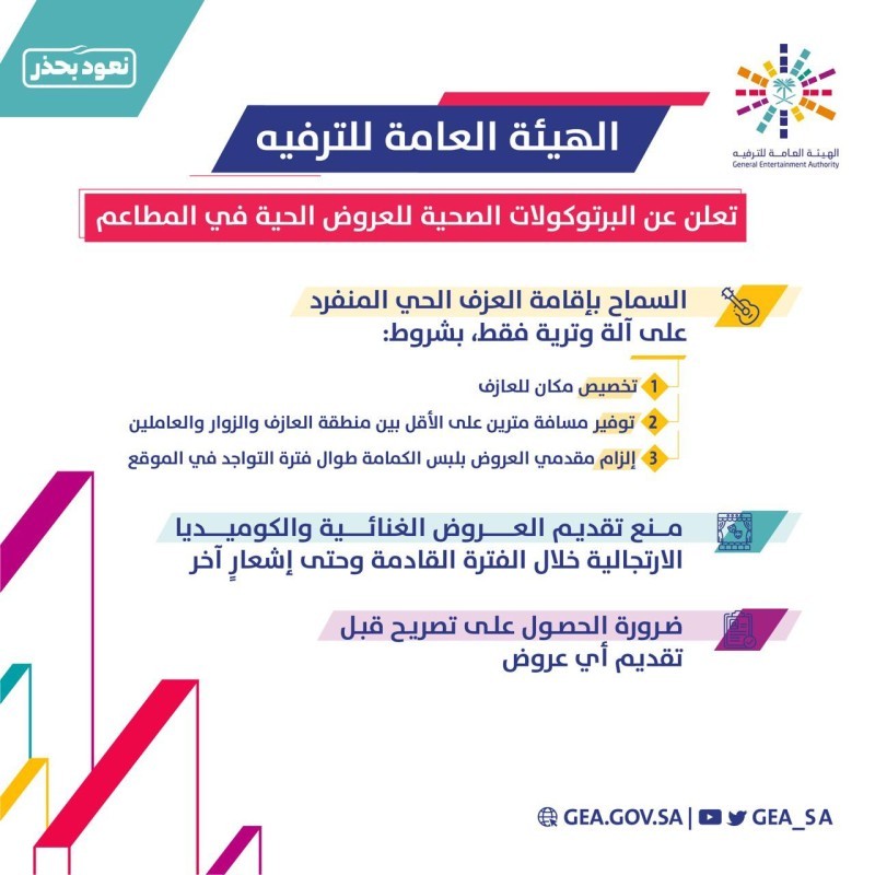 أعلنت الهيئة العامة للترفيه البروتوكولات الصحية الخاصة بالعروض الحية في المطاعم والمقاهي، التي اشتملت على السماح بإقامة العزف الحي المنفرد على آلة وترية فقط، إضافة إلى اشتراط تخصيص مكان للعازف، مع ضمان توفير مسافة مترين على الأقل بين منطقة العازف والزوار والعاملين، كما شددت الهيئة على إلزام مقدمي العروض بلبس الكمامة طوال فترة الوجود في الموقع، في حين منعت الهيئة تقديم العروض الغنائية والكوميديا الارتجالية خلال الفترة القادمة حتى إشعار آخر، مع التأكيد على ضرورة الحصول على تصريح قبل تقديم أي عروض.