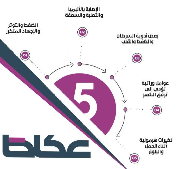 تساقط 50-100 شعرة يوميا أمر طبيعي، لاسيما أنها تعاود النمو مرة أخرى وبنفس السرعة. ووفق الأكاديمية الأمريكية للأمراض الجلدية، تؤدي 5 أسباب إلى تباطؤ نمو الشعر أو توقفه، ما يؤدي إلى الصلع المبكر، أهمها الضغط والتوتر والإجهاد، أو الإصابة بأمراض الغدة الدرقية وفقر الدم وداء الثعلبة، والتهابات فروة الرأس مثل السعفة، علاوة على استخدام بعض الأدوية المعالجة للسرطان وارتفاع الضغط والتهاب المفاصل ومشكلات القلب، كما ينتج عن العوامل الوراثية ترقق بويصلات الشعر يبدأ بعمر 30-40، ناهيك عن الأغذية المفتقرة للبروتين والحديد، والتغيرات الهرمونية، خلال الحمل والبلوغ وانقطاع الطمث، وبعض الأمراض مثل التهاب الأمعاء والقولون التقرحي.