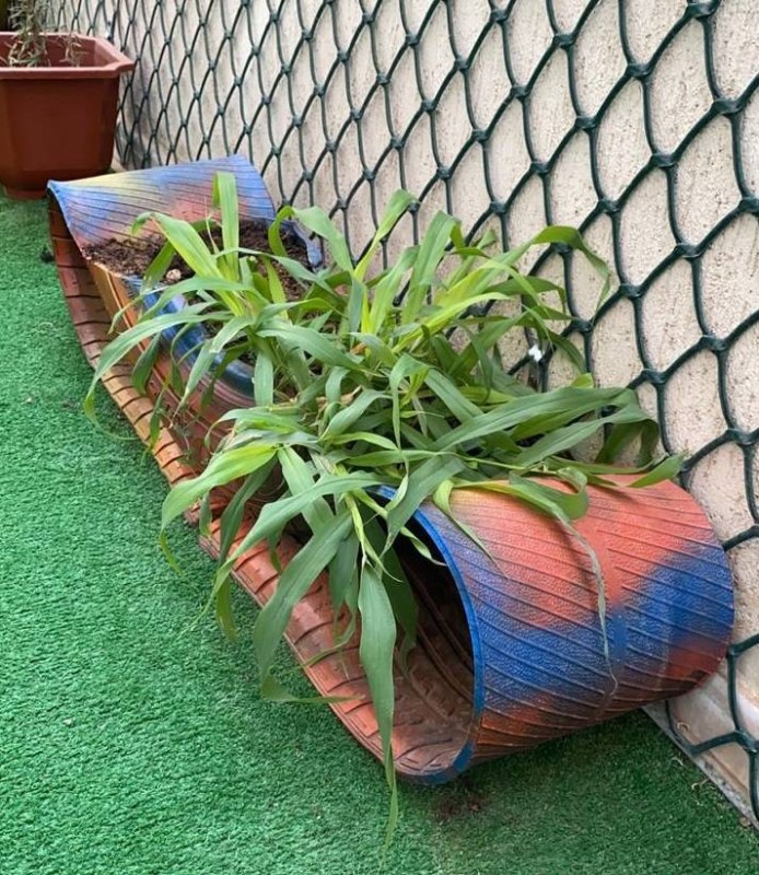 حول معلم في إحدى المدارس الابتدائية بمكة المكرمة إطارات السيارات إلى أحواض زراعية ذات لمسات جمالية وفنية.