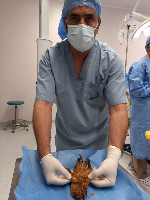 قطعة القفاز بعد استخراجها من أمعاء الطفل.