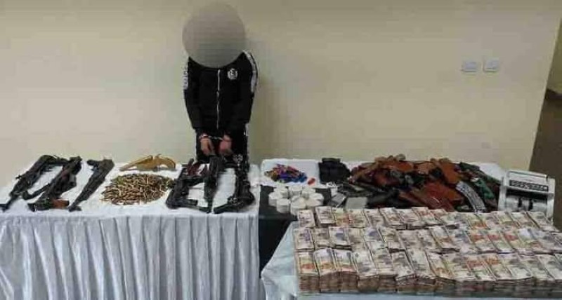 ولفتت إلى أنه «ضبط بحوزته 3 كيلوغرامات من الھیروین المخدر و6 بنادق آلیة و66 مخزنا، وكمیات من الطلقات، كما أرشد عن مكان إخفاء المواد المخدرة والأسلحة الناریة، حیث عثر على مبالغ مالیة بلغت أكثر من 3 ملايين جنیه».