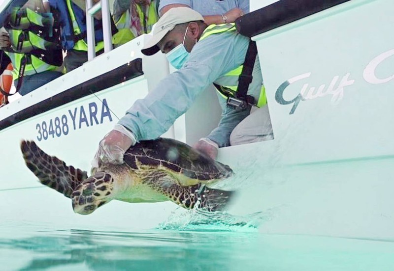ضمن مبادراتها لحماية السلاحف النادرة، أعادت شركة البحر الأحمر اليوم (الثلاثاء) سلحفاتين من الأندر في العالم لبيئتهما الطبيعية بجزيرة «الوقادي» بعد تماثلهما للشفاء. فيما أوضح المدير الأول للامتثال والتنفيذ بالشركة خالد الدهلوي أن الإدارة تلقت بلاغين في 2 و3 أبريل الماضي بالعثور على سلحفاتين عاجزتين عن الغوص، وبالتواصل مع مركز تنمية الحياة الفطرية نقلتا لأحد المراكز المتخصصة بجدة لعلاجهما وتأهيلهما. وبعد تماثلهما للشفاء أطلق عليهما «أمل» و«حياة»، وأدرجت «أمل» ضمن برنامج تعقب السلاحف. يذكر أنهما من «السلاحف صقرية المنقار»، وتتمتعان بمزايا فريدة منها زوج من المخالب الصغيرة على كل زعنفة، ويبلغ طولهما 65-90 سم، ويصل وزنهما ما بين 45-70 كجم.