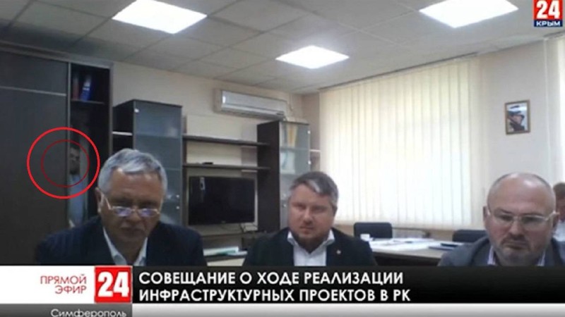 وخلال الاجتماع الذي عقد بالفيديو، تحدث وزير النقل في الجمهورية يفغيني إيساكوف، وخلال كلمته ظهر شخص مجهول في الخلفية من خزانة ملابس مفترضة.