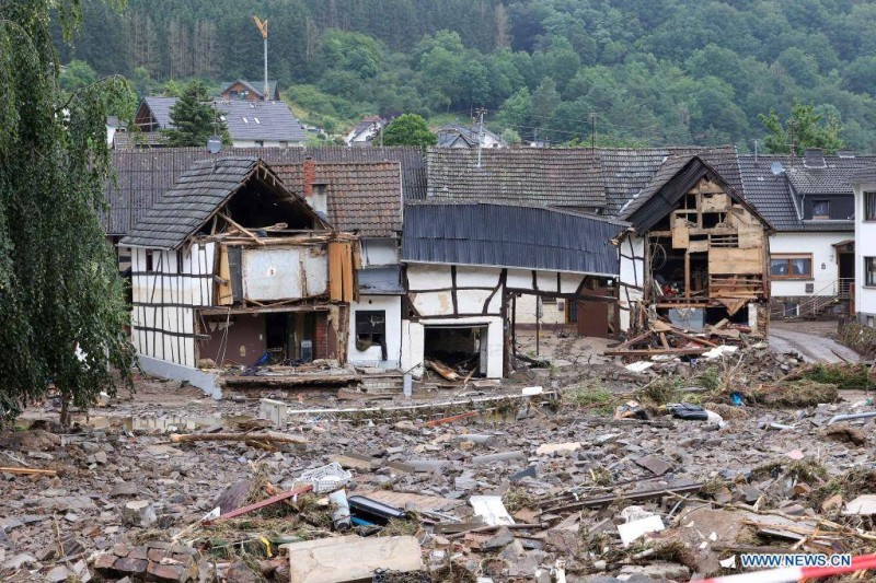 الطرقات والمنازل متأثرة بتبعات الفيضانات في قرية ألمانية أمس. (شينخوا)