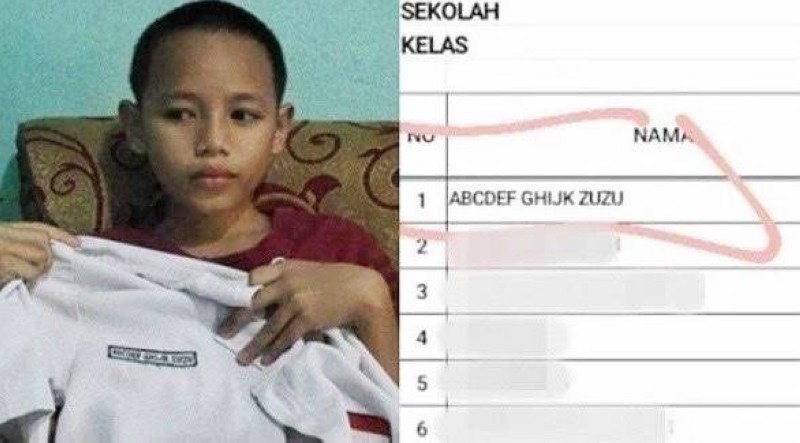 احتل طفل عناوين الأخبار في إندونيسيا بسبب اسمه الغريب ABCDEF GHIJK، وحظي بشعبية كبيرة على مواقع التواصل الاجتماعي ليس بسبب موهبة مميزة يمتلكها، ولكن بسبب اسمه الغريب المكون من تسلسل مجموعة من الأحرف الأبجدية، وكان والد الصبي، البالغ من العمر 12 عاماً من مقاطعة سومطرة الجنوبية بإندونيسيا، سمّى ابنه بأول 11 حرفاً في الأبجدية الإنجليزية، وتم اكتشاف الاسم الغريب بالصدفة، عندما شارك الصبي في حملة تطعيم نظمتها الشرطة المحلية في منطقة «موارا عنيم».
