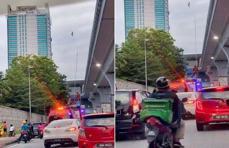 وتظهر في الفيديو فرق الإنقاذ وهي تحاول جذب الطائر إلى الأرض وتسبب ذلك بعرقلة حركة المرور والازدحام في الموقع.