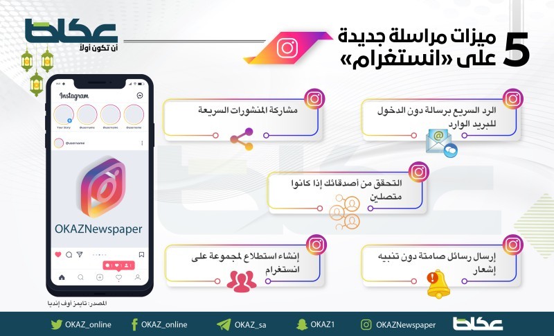 أعلنت «انستغرام» مجموعة من ميزات المراسلة الجديدة للمستخدمين. تقوم المنصة المملوكة لشركة فيسبوك باختبار هذه الميزات لبعض الوقت، وتعتبر الميزات الجديدة جزءاً من خطة الشركة لتعزيز الرسائل ومقاطع الفيديو على المنصة، وأهم الميزات الجديدة التي أعلنت عنها انستغرام، بحسب ما أوردت صحيفة تايمز أوف إنديا، تتعلق بالمحادثات والتراسل والخصوصية.