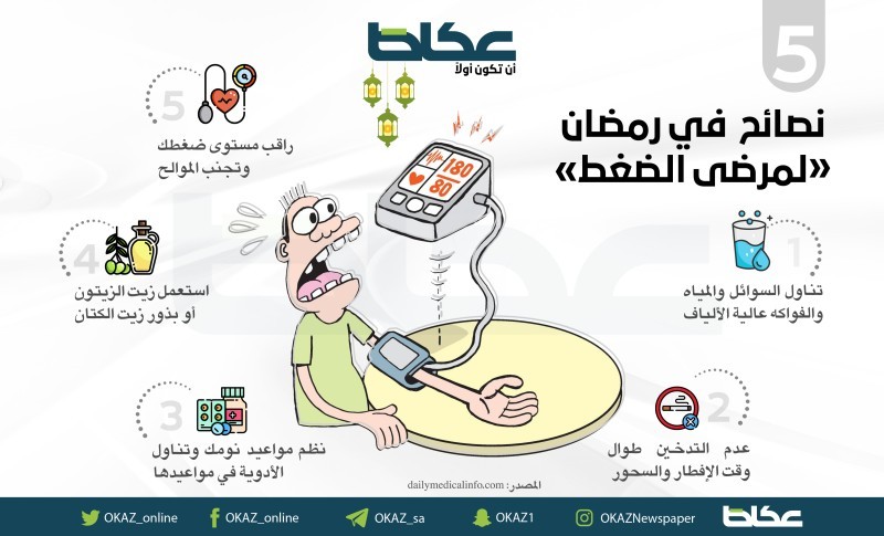 يواجه مرضى الضغط العديد من المشاكل الصحية مع الصيام ودرجة الحرارة المرتفعة، ويزداد الأمر سوءاً مع عدم اتباع نظام غذائي صحي مناسب لحالاتهم، ووجدت دراسة حديثة أجريت حول تأثير الصيام على مرضى ارتفاع ضغط الدم في رمضان بحسب «dailymedicalinfo.com»، أن الصيام آمن على الأفراد الذين يعانون من درجات بسيطة أو معتدلة من اضطراب ضغط الدم، ونصحت بعدة أمور خلال وجبتي الإفطار والسحور.