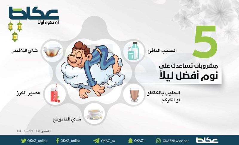 قال موقع «مايو كلينك» إن البالغين يحتاجون إلى 7 ساعات أو أكثر من النوم ليلًا بشكل منتظم، لتفادي مشكلات مثل زيادة الوزن ووجود مؤشر كتلة الجسم 30 أو أعلى، والسكري وارتفاع ضغط الدم وأمراض القلب والسكتة الدماغية والاكتئاب، وغيرها من الأمراض، ونصح بالتركيز على حسن اختيار ما يتم تناوله من مشروبات قبل النوم، واعتبرها من العوامل الرئيسية التي يمكن أن تمنح نومًا أفضل ليلاً، وتضمن تقرير نشرته العربية عن موقع Eat This Not That معلومات عن أفضل 5 مشروبات ينصح بها قبل النوم.