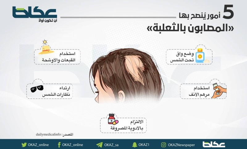 تُعتبر الثعلبة من أشهر الحالات الجلدية التي تتسبب في تساقط الشعر، ولأن الحصول على شعر قوي وصحي من أهم الأمور بالنسبة للنساء والرجال على حد سواء، يبحث مصابو الثعلبة عن أفضل الطرق لعلاجها، ويتوقف ذلك على عدة عوامل أبرزها السن، كمية الشعر المفقودة، مكان فقدان الشعر، كما أنه لا يوجد علاج واحد بعينه يناسب الجميع، حيث يتطلب علاج الثعلبة تجربة عدة طرق مختلفة للوصول لأفضل طريقة مناسبة، ولكن ينصح الأطباء باتباع 5 أمور لمن أصيبوا بالثعلبة بحسب dailymedicalinfo: