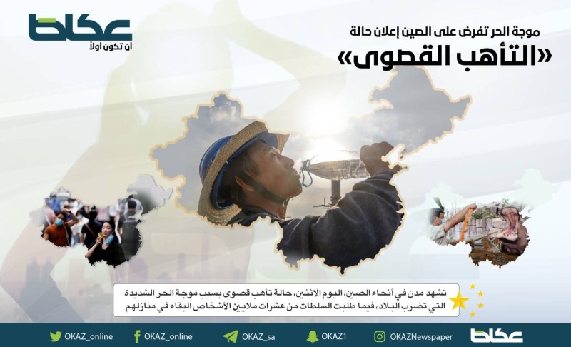 تشهد مدن في أنحاء الصين، اليوم (الاثنين)، حالة تأهب قصوى بسبب موجة الحر الشديدة التي تضرب البلاد، فيما طلبت السلطات من عشرات ملايين الأشخاص البقاء في منازلهم.