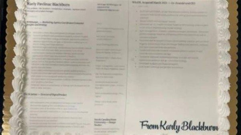 استعملت سيدة أمريكية فكرة غريبة بإرسال سيرتها الذاتية مطبوعة على قالب حلوى إلى شركة بُغية الحصول على وظيفة، وأرادت أن تتقدم على الآخرين في المنافسة على وظيفة بعدما علمت أن الشركة المعنية فتحت باب التوظيف، بحسب موقع «نيويورك بوست». وكتبت كارلي بافليناك بلاكبيرن، من كارولاينا الشمالية على حسابها بموقع «لينكد إن»، أنها تقدمت للمنافسة على وظيفة لدى شركة «نايكي» الأمريكية العملاقة، وأرسلت سيرتها الذاتية على ظهر قالب حلوى». ويبدو أن هذه الفكرة قد أثمرت، إذ قالت كارلي إن مقابلات قريبة حددت لها مع ممثلي الشركة.
