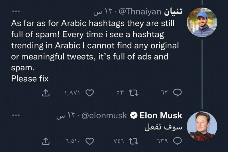 تفاعل مالك منصة «تويتر» الملياردير الأمريكي إيلون ماسك، بتغريدة دوّنها باللغة العربية، ردا على تغريدة شاب سعودي طالب بمعالجة وضع الهاشتاقات العربية وما تحتويه من إعلانات مضللة ومشاركات مزعجة لاعلاقة لها بمواضيع الهاشتاقات.