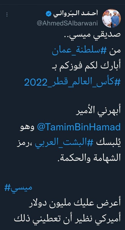عرض عضو مجلس الشورى السابق العماني أحمد البرواني، عبر حسابه بتويتر على النجم الأرجنتيني ليونيل ميسي مليون دولار، مقابل «البشت» الذي أهداه له أمير قطر الشيخ تميم بن حمد آل ثاني، إثر فوز الأرجنتين بكأس العالم.